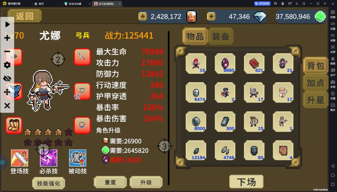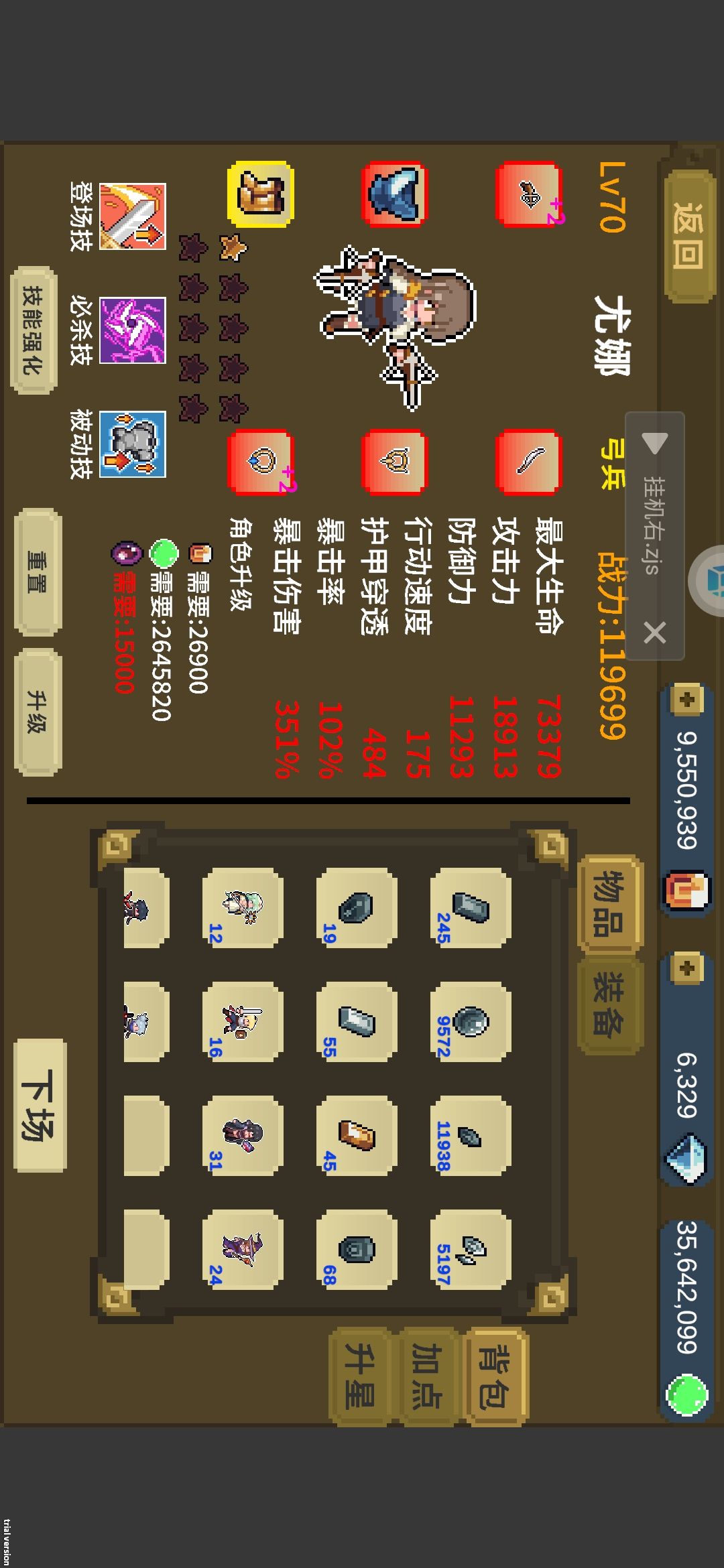 前言:玩这游戏,最好要有个云手机,然后在下载个点击器。 游戏最主要的东西就是英雄进阶石,获取方法:BOSS掉落,离线奖励,广告。 尤娜可以秒杀哪里的怪就挂机哪里,一般挂1-1。1-15。2-15。3-15。4-15。 装备最主要的属性:尤娜是暴击爆伤。其他英雄是速度,暴击爆伤,优先速度装备。 开局选法师,其他俩职业一般般。 选法师去刷图,升级,做任务凑齐三个职业。凑齐后去刷1-1,用点击器设置一下