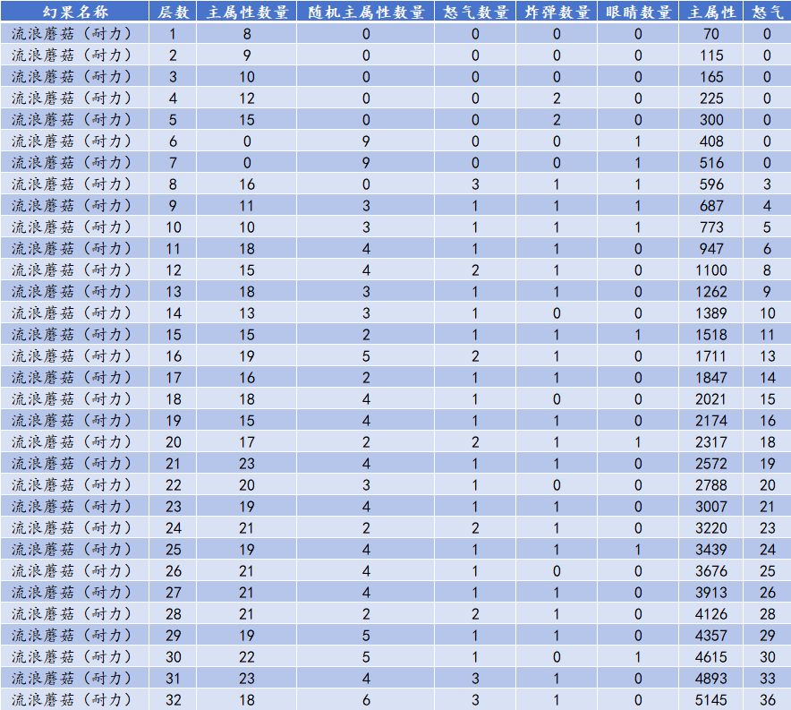 目前层数汇总(12.9): 蘑菇32(耐力) 花精灵28(灵巧),咩咩30(力量),深海30(灵巧) 花精灵28(精神),度玛30(智慧),深海36(精神) 10.16 耗费了一些时间,制作了一个流浪蘑菇前30层属性表,可以帮助追求极限但生长素不足的小伙伴更好的利用点数(因为我的蘑菇只有30层,所以后面两层没有数据) ——————————— 10.16 在团员帮助下补充了蘑菇后两层,成功助他登顶幻