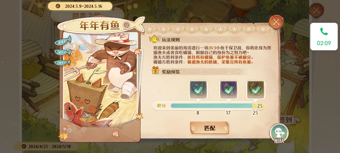 年年有鱼怎么快速刷满25分,手把手教你。 第一步,进去以后,当前频道问刷不刷分,如果 刷就全去左上角(去哪都行,角落好找点); 第二步,渔夫放追踪白鲨,小猫不跑给咬; 第三步,渔夫抓捕小猫,猜拳渔夫出拳,小猫出剪刀(出什么都行,让渔夫赢就可以); 第四步,小猫救助被抓住的小猫; 第五步,渔夫刷满14分以后,每只小猫各采集5个鱼篓,游戏结束。 注意事项: 1、每个渔夫需要追踪2次,抓捕2次,总计14