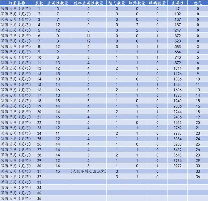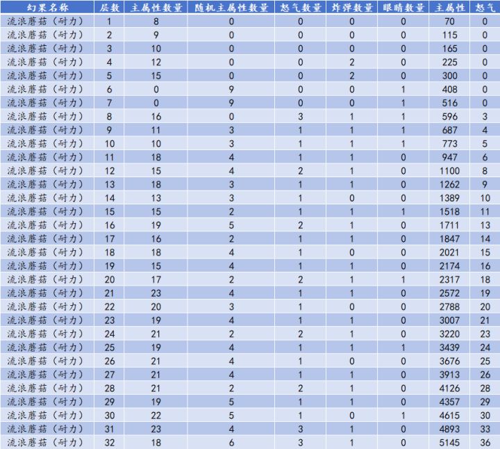 目前层数汇总(12.9):蘑菇32(耐力)花精灵28(灵巧),咩咩30(力量),深海30(灵巧)花精灵28(精神),度玛30(智慧),深海36(精神)10.16 耗费了一些时间,制作了一个流浪蘑菇前30层属性表,可以帮助追求极限但生长素不足的小伙伴更好的利用点数(因为我的蘑菇只有30层,所以后面两层没有数据)———————————10.16 在团员帮助下补充了蘑菇后两层,成功助他登顶幻