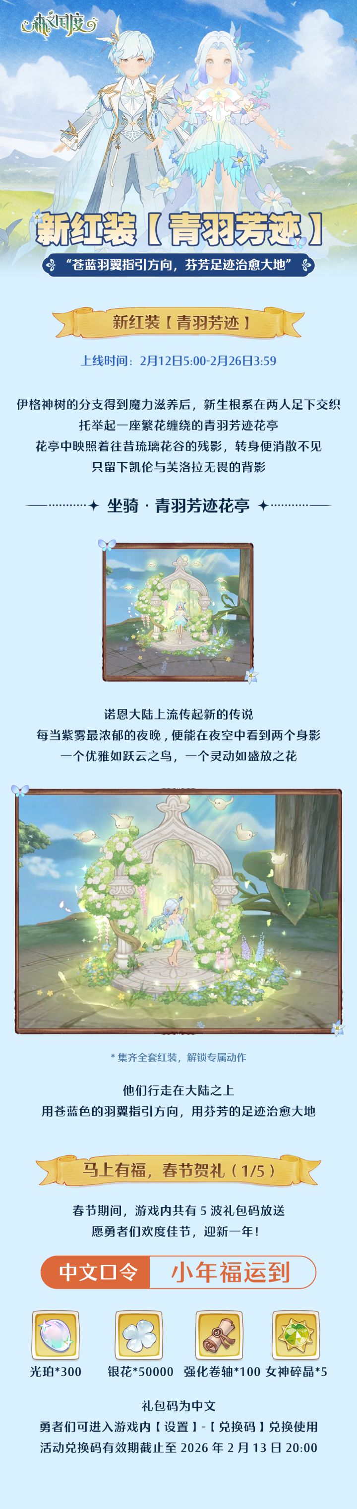本米祝各位勇者新春快乐~春节期间,游戏内共有5波礼包码放送。愿勇者们欢度佳节,迎新一年!礼包码口令【小年福运到】
