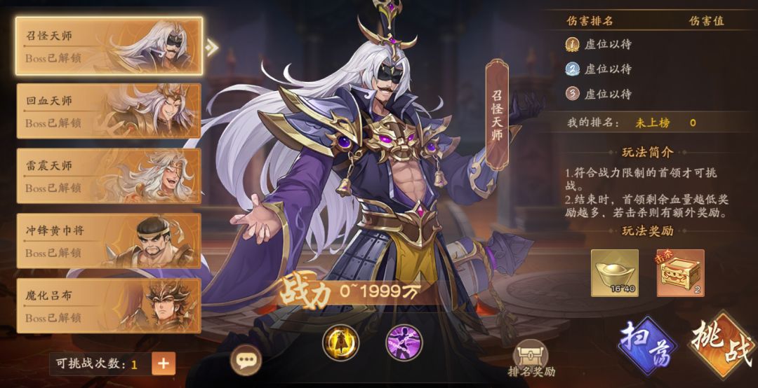 >>>亲爱的召唤师们,你们好呀! 时逢乱世,常有妖魔作乱,恶人横行。若经此路,唯有奋勇前行,镇妖除魔,斩尽邪祟,予天下太平! >>>玩法规则: ✦镇妖台中有多个不同难度的首领,玩家需要逐个击杀解锁新首领,解锁新首领可额外获得一次挑战次数 ✦挑战次数将会每日刷新,已击杀首领的玩家可使用扫荡功能,扫荡会按照最短通关时间记录进行上榜和发放奖励 ✦进入战斗后,武将只有在射程范围内没有小怪时才会攻击首领 ✦