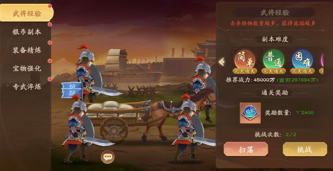 >>>亲爱的召唤师们,你们好呀! 日常副本的种类有很多,通常会掉落大量的经验、银币、装备等游戏道具,对提升整体实力有着至关重要的作用,召唤师们要记得每天上来扫荡一遍哦! >>>玩法规则: ✦日常副本分为武将经验副本、银币副本、装备精炼副本、宝物强化副本、专武淬炼副本 ✦日常副本开启时间:每天开启,0点重置 ✦日常副本在前置关卡通关后,且达到新难度的解锁条件后,会开启新的关卡难度 ✦当某一关卡完美通