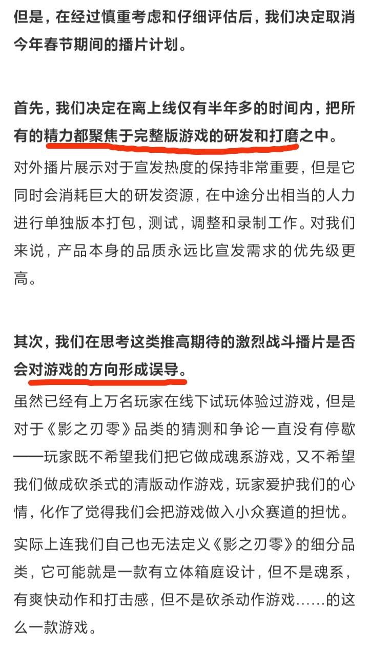 1月23号,《影之刃零》制作人梁其伟发文宣布,取消今年春节的播片计划❗❗❗原因是,距离9月9日的发售期还是太近了。一是团队要把精力放到研发/打磨中;二是怕播片误导玩家对游戏的类型判断。在过去的两年春节期间,他们分别放出了龙年2D动画短片和荒行子关卡预告,蛇年的七星剑阵预告。这有点拉高玩家的期待了,同时也会大量消耗团队精力和经费,特别是在距离发售还有半年多的时候。索性就取消今年