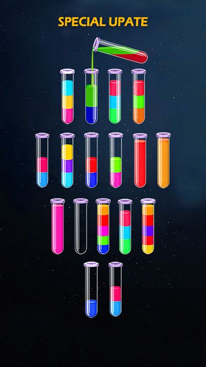 水拼图游戏:颜色排序是一款有趣且具有挑战性的水拼图游戏,具有高清图形和高质量的排序支持拼图游戏。将不同颜色的液态水进行分类,并根据液体颜色将彩色水倒入杯子中,使每个瓶子装满相同的水颜色。