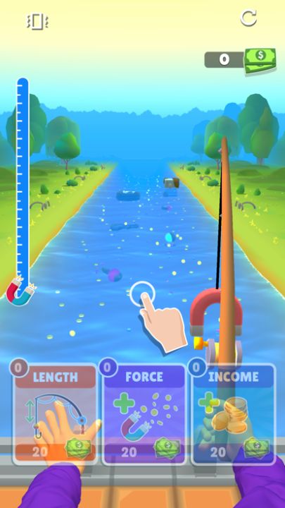 We throw a fishing rod with a magnet attached to a water with metal objects on the ground. By controlling the fishing line with swerve, we catch these metal objects and generate income. When attra...