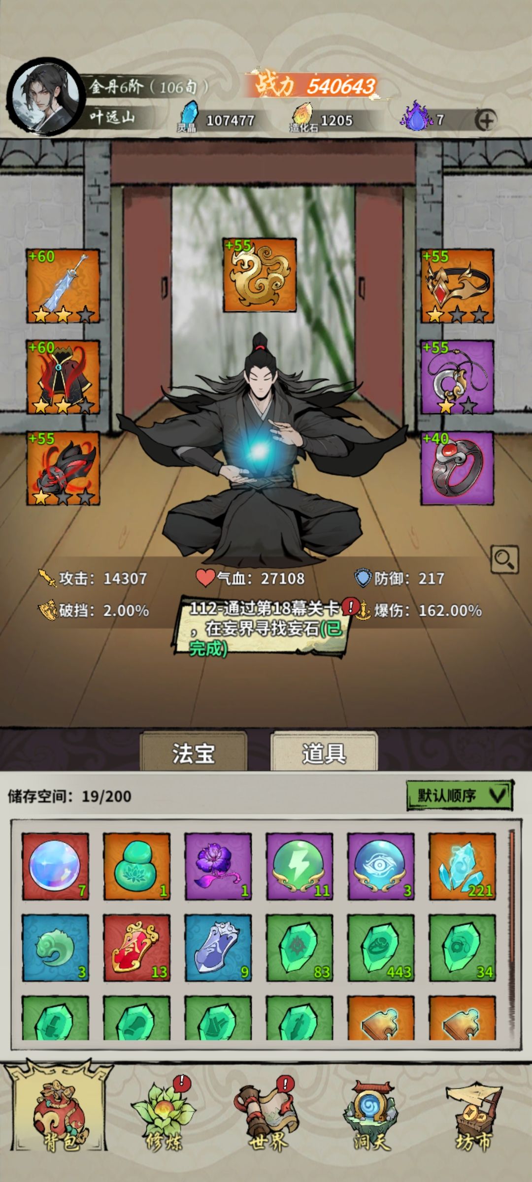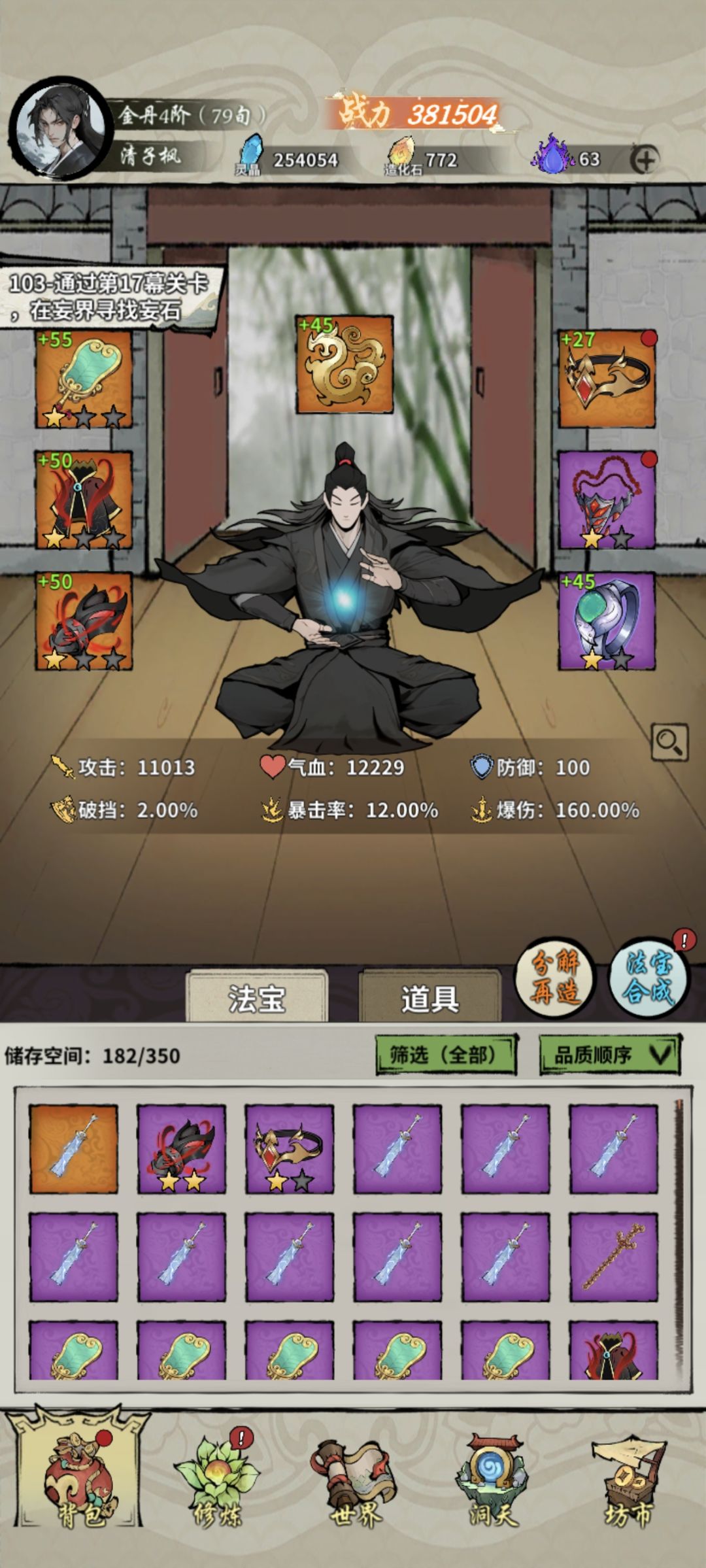 游玩基础 《1.01版本》 装备:见图1 武器:见图2 功法:见图3 技能:见图4 坊市:见图5 《v1.1更新》 图6:符箓主要出产地-幻境 (1.1版本主要更新内容:强化石出产方式增加,为装备添加更多可玩度,给毕业玩家提供更多思路) (弊端:词类符箓过于随机,萌新难以抄作业,毕业的整活佬玩花活最好给其余玩家提供玩法思路) == 提示:(萌新-及金丹以下玩家可直接跳到装备解读) 点击奇地-隐秘之