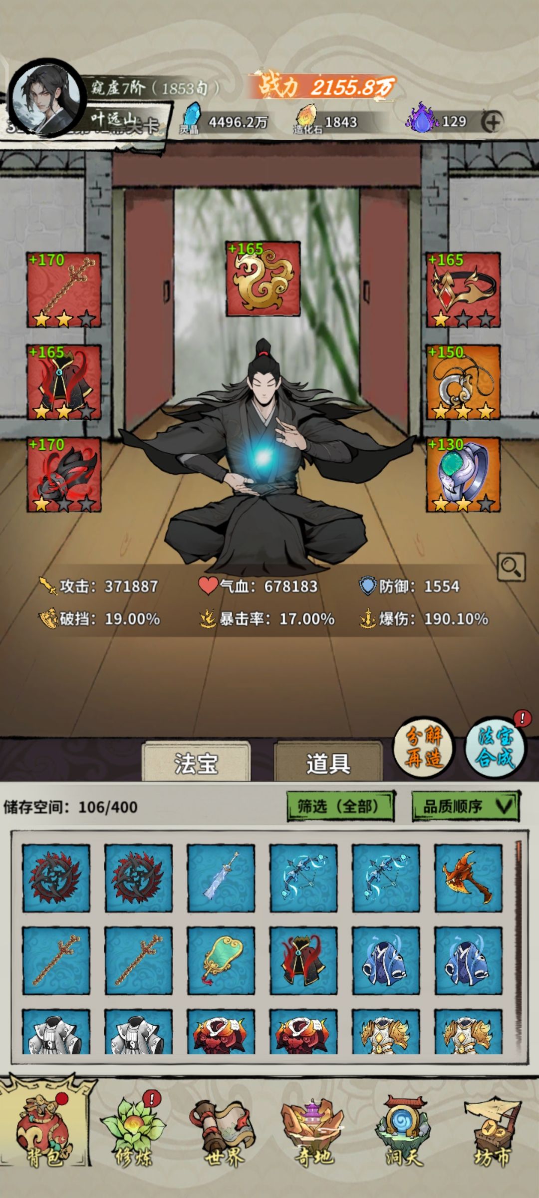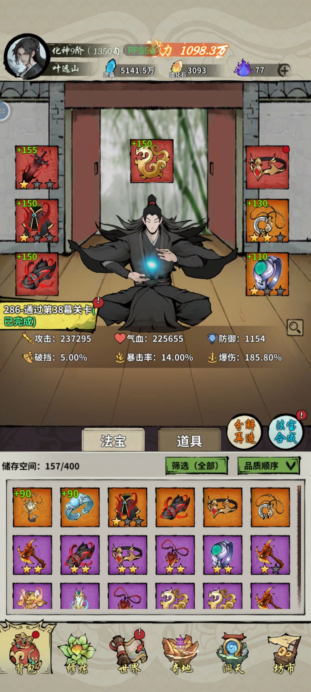 第一把出了2个风,前几关每关一个风优先仙风,后面捡铜钱,11关仙铜钱,14关仙火,14boss还能多打好几百万,运气好路上吃了3了蓝道行,暴击塔和四合印正常每关2个绿色,12关3紫宝物 奇物方面6减速4冷却12个7%攻击可能是能够碾压的关键吧,没有流星泪 如果肯凹开局的话,分可能会更高一点点,祝大家早日拿下成就 称号是40关卡仙风和仙瓜60万攻击刷出来的,刚刚好126斩