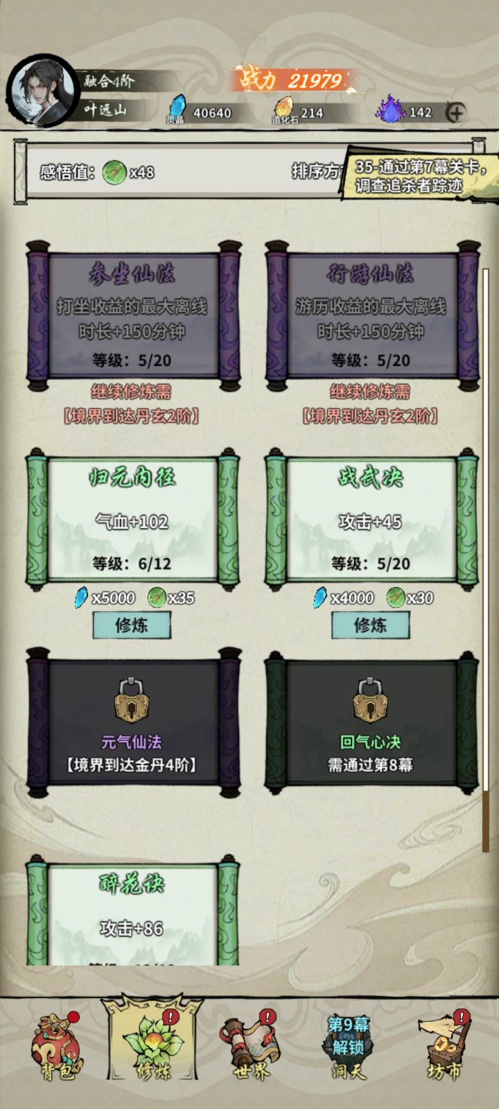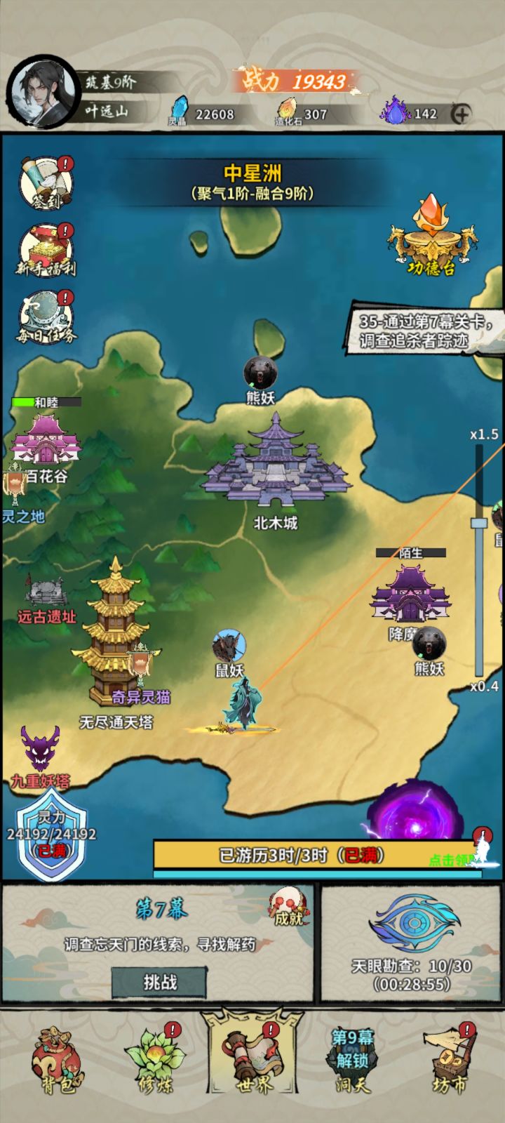 道友们重进游戏,更新内容就可以生效啦~1、降低功法中元气仙法的解锁条件2、北木东煌等宝阁中新增元气出售3、新增洞天建筑【百战剑冢】(完成特定历练任务后获得),进入剑冢后挑战成功可获得不菲的剑冢奖励。4、增加橙色法宝分解为紫色的选项5、新增战力成就(需第二天解锁)6、新增游戏世界时间,在角色头像旁显示(现实24小时=游戏内24旬)7、降低遗迹事件里挑战的境界条件8、略微提高道修的技能
