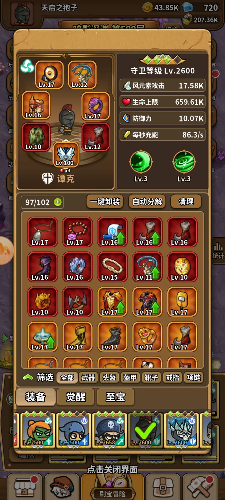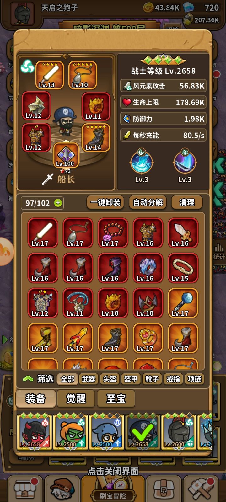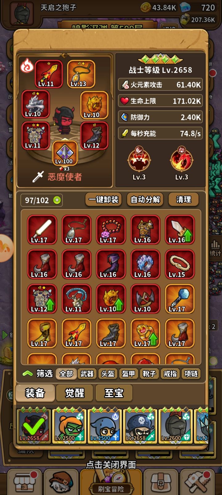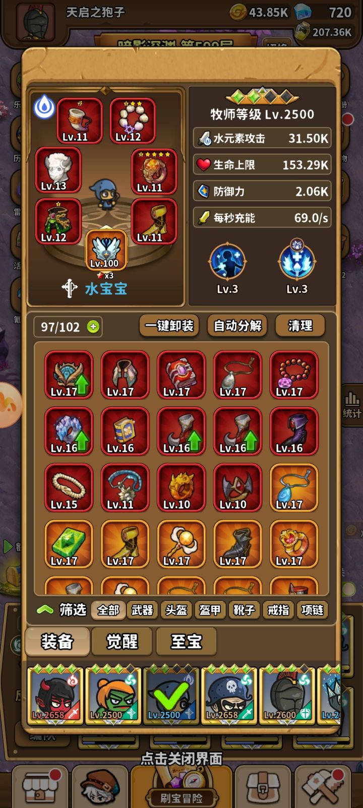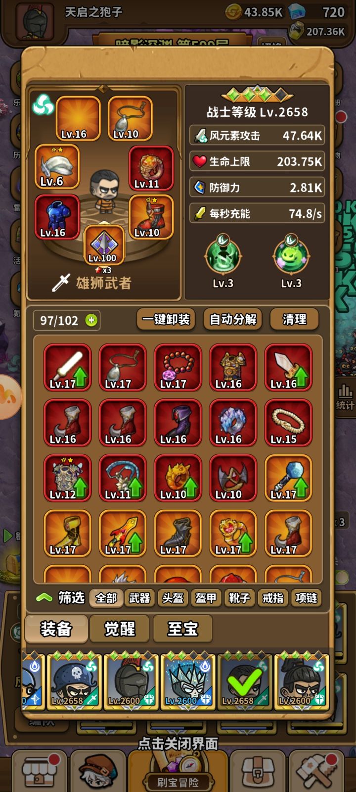 大佬,前期带什么属性装备,我刚玩第七天,目前卡在第三个图200多关,带的五金反击,两金一紫水月我是看着大佬阵容选的英雄,可惜第三天才看到,浪费了好多券抽光射