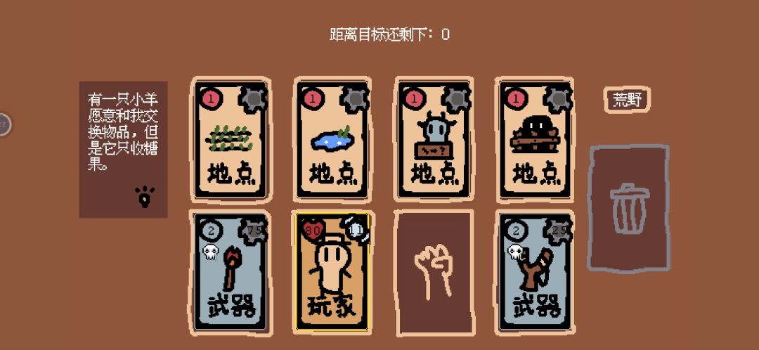 摸索了一下感觉这个游戏不算难,只要开局开好,之后就是刷刷刷了 首先开局树枝+草合成火把,树枝+树枝合成弹弓,火把能把1血草转换为2伤弹药,弹弓把1伤石子转化为2伤弹药弹药如果用完了,只剩下1耐久了的话不要用 第一关的树林过去之后选择第四个卡牌吃苹果(反复免费吃),然后去第三个商店买10块的加血量上线的吃掉,再去第一个草地关卡 草地关卡过了之后可以去商店(第四个)买15块2伤8耐久的狗,有信心的可