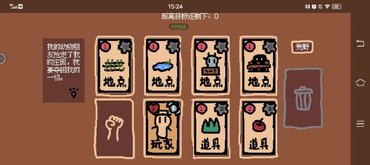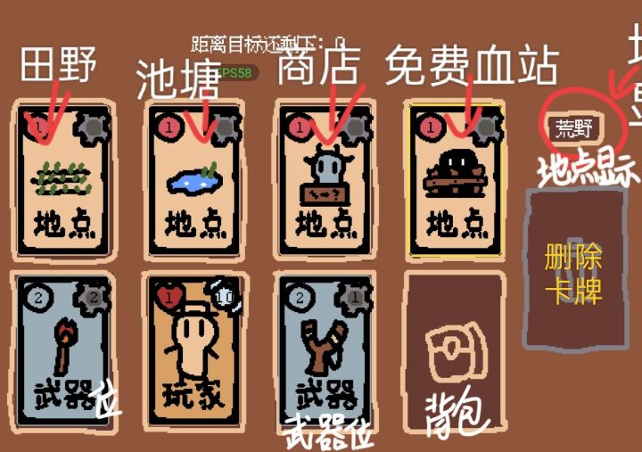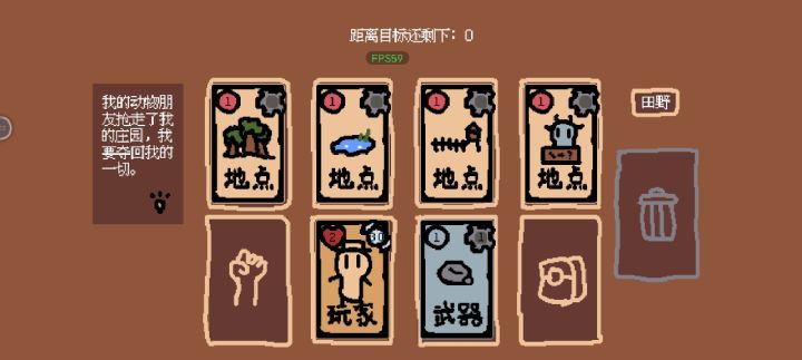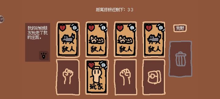 没有存档:游戏开始后不能退出、删除后台,后果是清空进度,从头开始半成品:信息没有收集完,只整理了部分信息。界面信息与基础设定对局页面图文字信息:根据当前玩家进度进行的信息提示,包含了游戏的世界设定和游玩提示。·》点击灯泡按钮切换到下一条信息·》信息是循环展示的·》玩家游玩到下一进程会提供新的信息荒野:代表玩家当前的位置上方的四张卡牌:事件牌·》距离目标还剩下33:还有33张隐藏