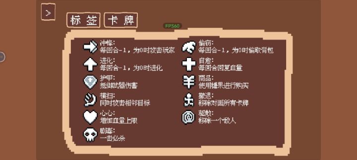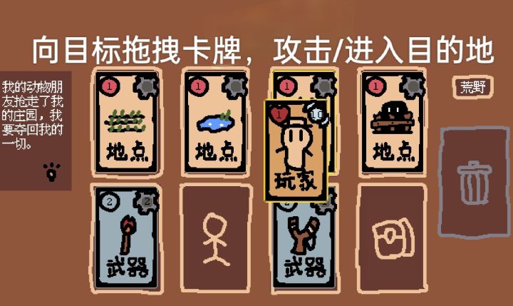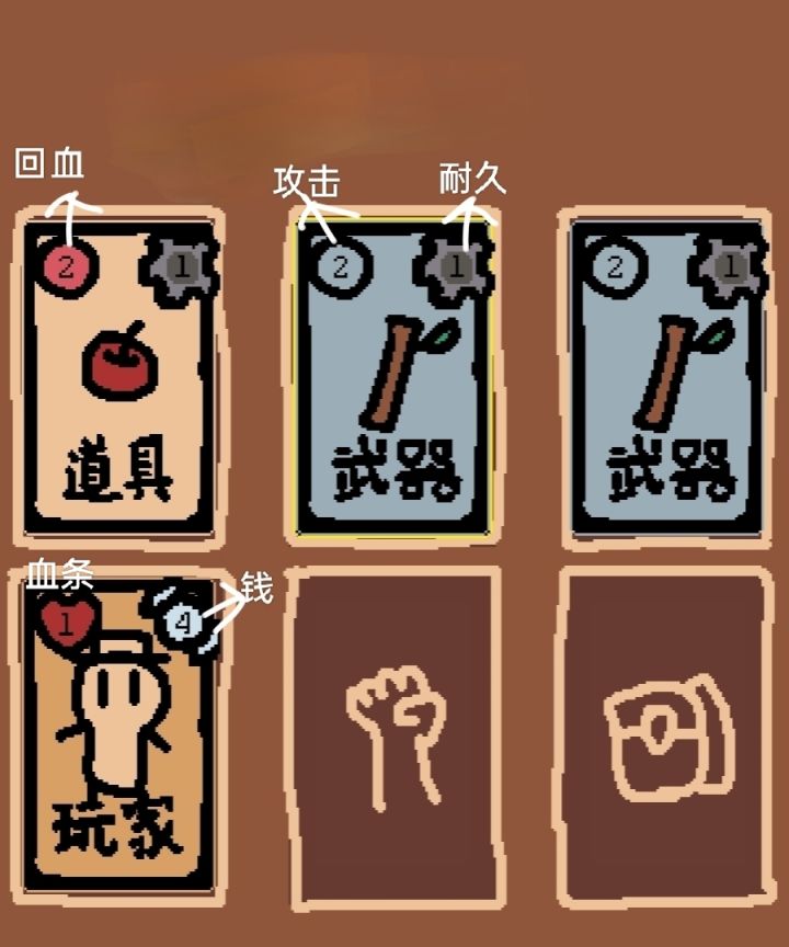 战斗界面,上面一排是攻击对象和随机物品,下面一排从左到右分别是左手、玩家、右手、背包。最左边是文字介绍(需要将对方拖动到玩家上才会触动,反过来不行)距离目标是打怪的数量。最右边的垃圾桶可以丢弃物品。注意:※放到背包的武器无法使用,要将其拖动到左右手才可以攻击,但是道具是可以使用的。※如果将武器碰到玩家照样会扣血,不管是不是左右手的武器。接下来我们一个一个来介绍。※玩家:玩家卡左上角是血量
