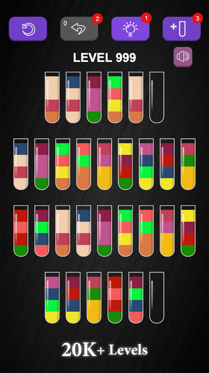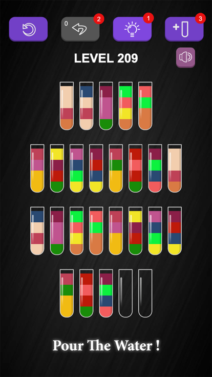 Try to sort the colored water in the tube until all colors in the tube is same. Pour colored water from one tube to another tube to complete the level