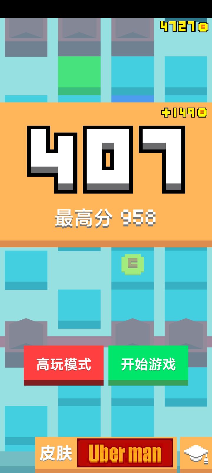 简洁的游戏主菜单,最上方写着游戏的logo,下依次是开始游戏.死亡模式·高玩模式。不是会从下方弹上来各种样子的方块。