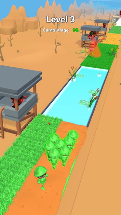 Camouflage and hide from enemies. Avoid lights and traps. Be careful where you step. Rescue the captive soldiers.