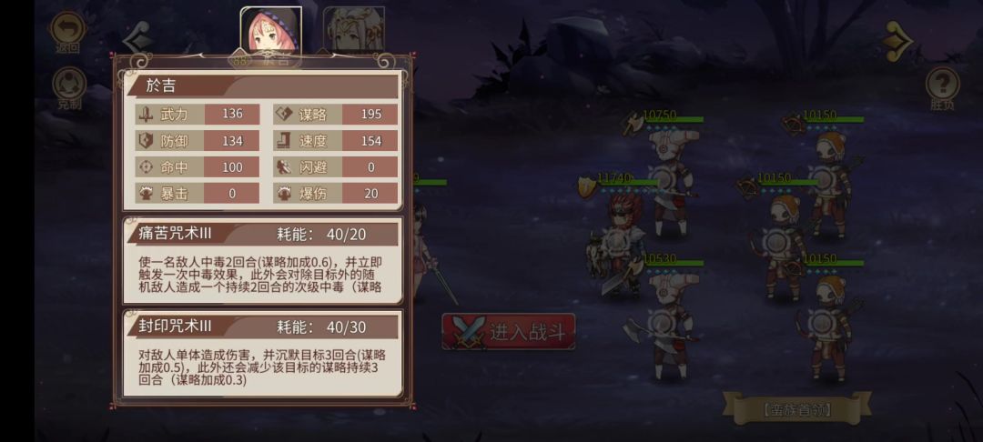 姓名:夏侯惇/夏侯敦 生日:6月12日 身高:163CM 血型:A型 三围:B80,W54,H79 爱好:漫画 喜欢的食物:烤鱼 职业:刀斧(虽然武器是模仿魔法少女用的魔杖,但实际上用法就是近战敲。) 技能介绍 技能1:红莲十字(4级好感时名称) 可对敌人单体造成伤害并恢复造成伤害的兵力 技能2:风暴之舞 造成单体伤害 人物背景 现役中二少女,自称“驱使狂风之大魔导师——塞西莉娅·西莱斯特”,对话