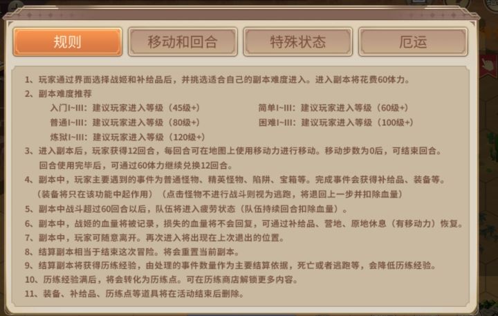 1.基本规则可以通过右上角❓查看,其中第2、5、11条与后面厄运的介绍为过期规则,无视即可,结算后重进所有视野会变回迷雾,出生点固定为长安,但去过的城市之间可以免费传送,如果没有特殊情况最好走到下个城市再考虑结算2.左边是任务栏,不知道该去哪就点一下任务,画面会跳转到该去的地点,主线任务的触发点一般有明显的标记很容易找,如果任务栏挡住了你要去的地方,可以点左上卷轴隐藏3.右边是交互栏,如果到了