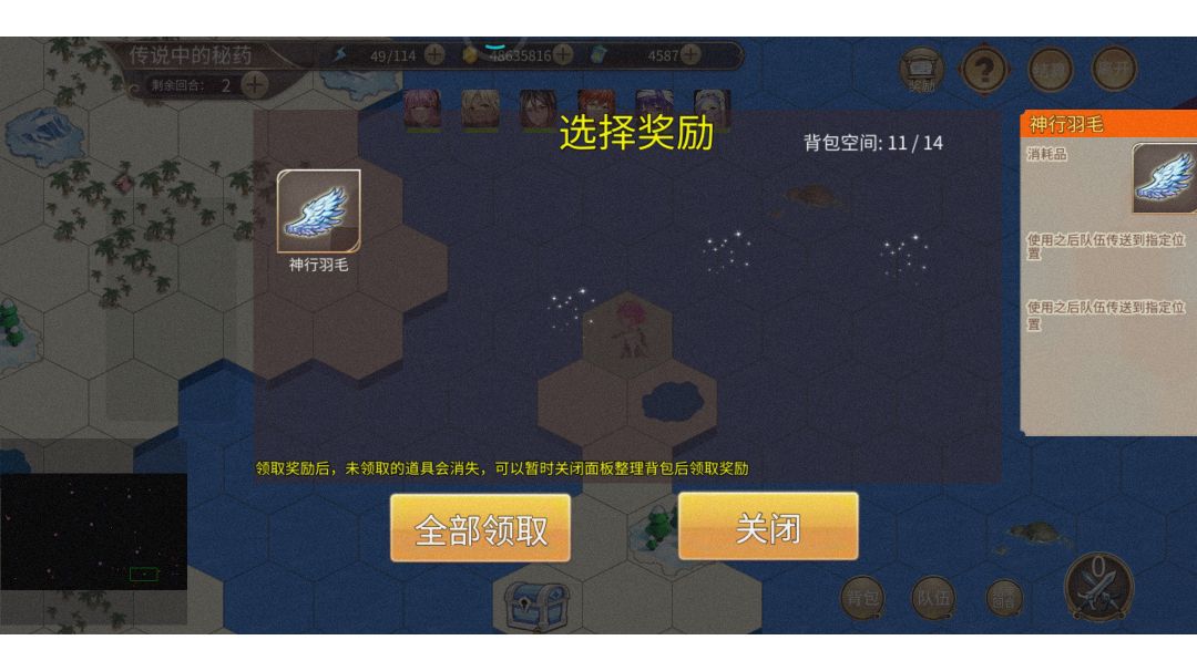 在图中这个位置,仔细看小地图,有一个蓝色的表示传送的点。可以联想到测试关50体其实是在暗示我们去踩这个多的蓝点。然后踩到了就能得到这个道具,飞向地图中间的小岛开宝箱(踩了这个蓝点后刷出来的),就能完成最后一个任务(大概)。 然而,点了领取后这个道具并没有出现在我的背包里。 视频是我用小号再走的一遍,还是一样。 所以我怀疑它是个bug,大佬们试试呢?