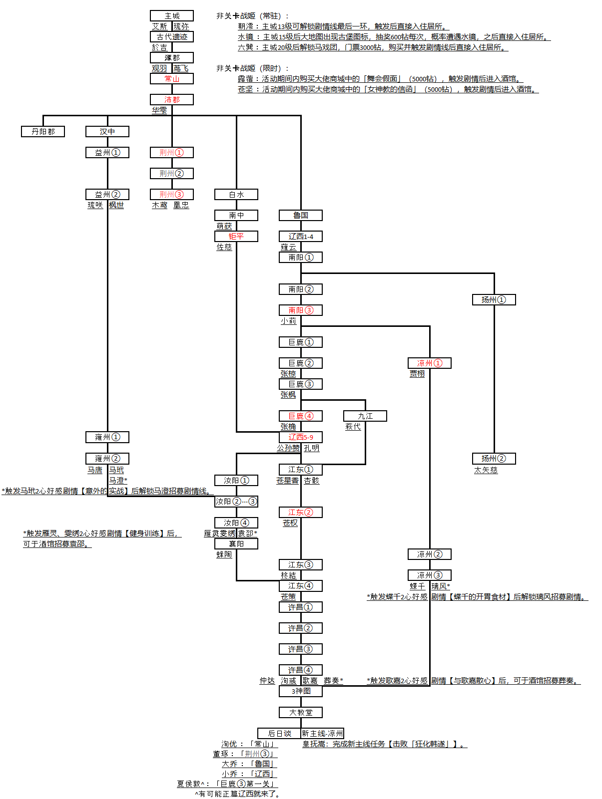 12/20/2025更新:补充了图二,内容为战姬入住条件。原帖:这个帖子在后日谈都成为历史的今天属实有点格格不入了其实这个帖子好几年前就应该发了,为了确认部分信息开了几个小号,但一方面没时间玩另一方面懒,最后就拖到现在_(:з」∠)_正篇流程从上到下以粗黑线连接,可以看到丹阳郡,荆州和扬州下方是没有板块连接的,事实上这3个都不打也可以通关正篇丹阳郡从剧情来看应
