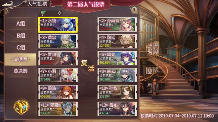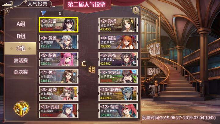 亲爱的城主大大:“第二届人气投票”正在火热进行中,A 、B、C三组人气战姬角逐已尘埃落定,C组的人气三甲刘备、太史慈、孔明已胜利入围总决赛。本周我们将迎来复活赛,谁是你们心目中的人气战姬,可以拿到最后三张通往总决赛的门票呢?!赶紧来告诉梦梦吧╭❤~【活动时间】现在(now)-2019年7月9日14:00【活动规则】按如下格式回帖告诉梦梦你认为谁将获得复活赛投票中的前三回复格式如下Tap昵