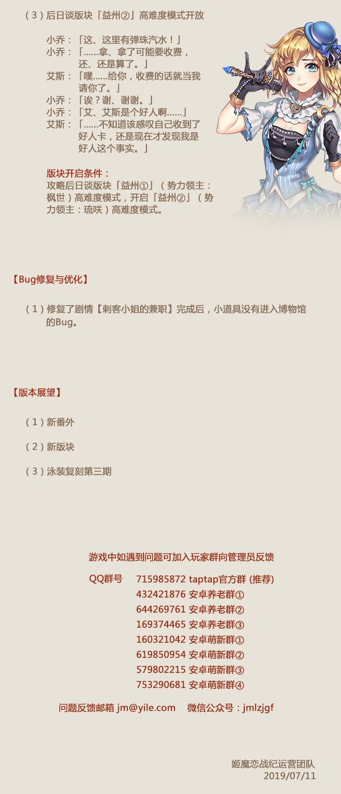 亲爱的城主大大:《姬魔恋战纪》将于7月4日进行更新维护,请各位城主留意更新时间哦!女皇杯小组赛即将落幕,晋级总决赛和复活赛的人员名单逐渐明朗。本次更新后即将开启复活赛投票活动,到底是哪三位幸运儿能获得最后宝贵的晋级机会呢?让我们拭目以待吧!太矢慈作为游戏的人气战姬,在C组投票活动中已基本锁定直通决赛的机会,本周我们会更新“刺客小姐的兼职”剧情,大伙是不是很期待呢?本周我们还会开启“夏日泳装