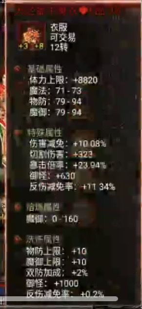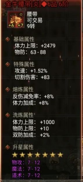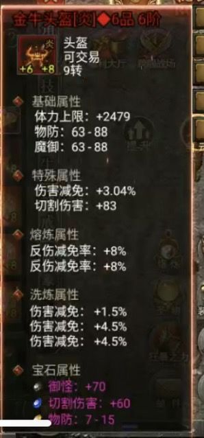 很多新手玩家好不容易到了能进生肖迷宫的阶段一进去一个技能,哎自己掉了半管血,因为自己的反伤减免属性太低,下面告诉大家最低成本获得反伤减免属性方法,1快人一步的金牛装备大家一定要留着,头盔在融练一下就16点反伤减免在洗炼伤害减免属性,直接一件就可以达到30左右的提升2翅膀升到6阶段有10的减免3治疗宝玉四件套属性有14点提升达到反伤要求了大家获得价值1288的神器套装12件生肖只是时间问题