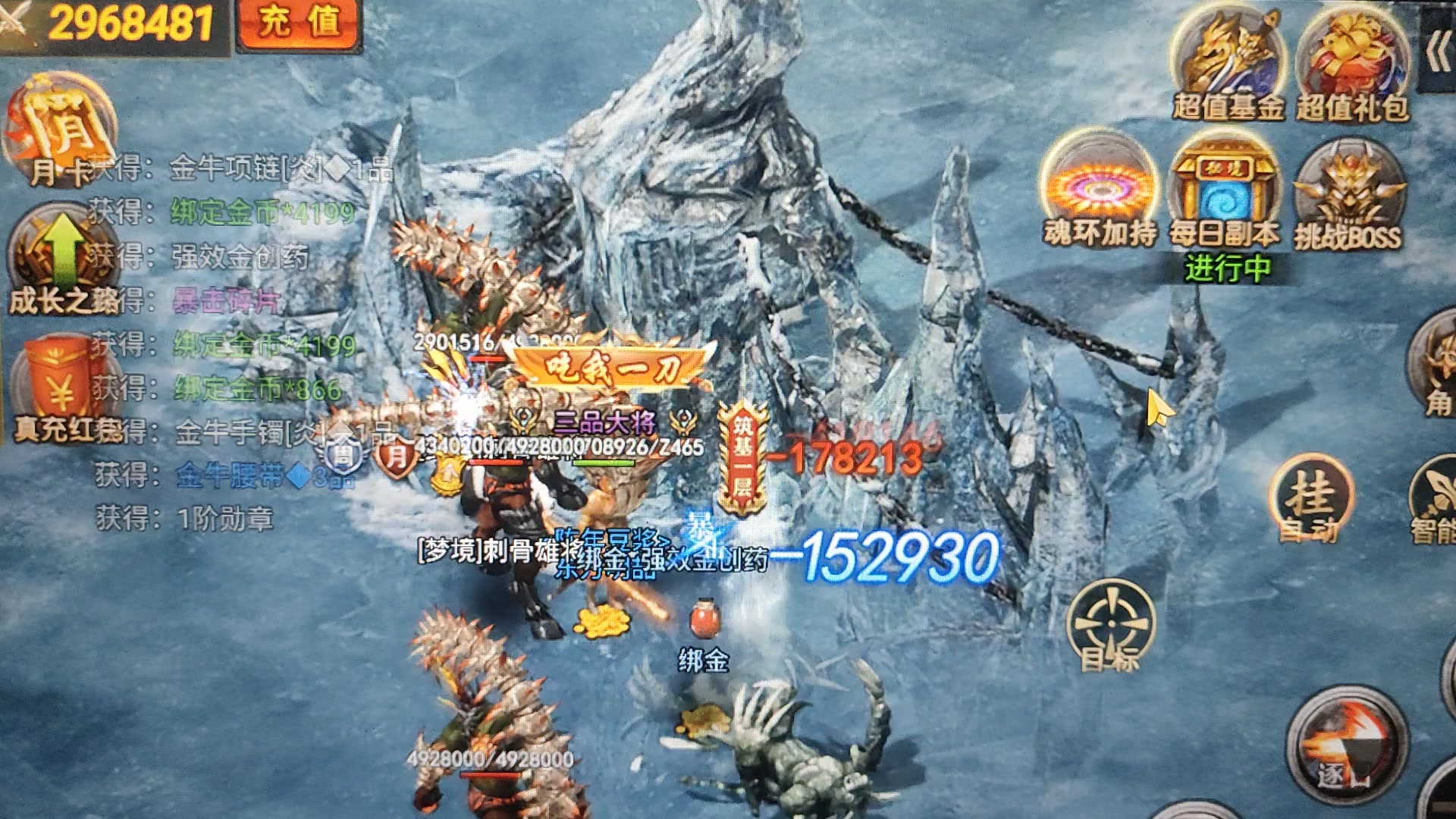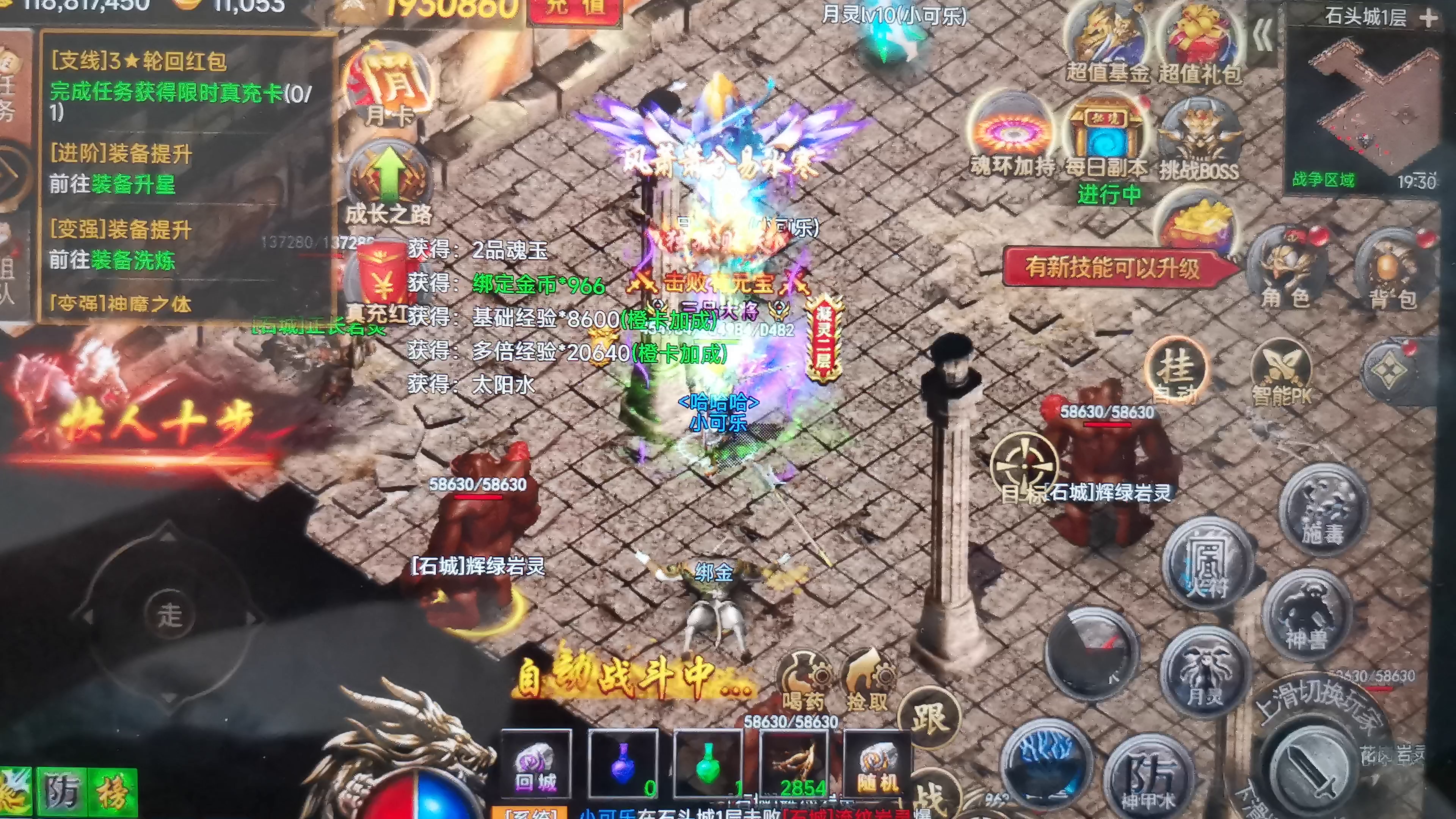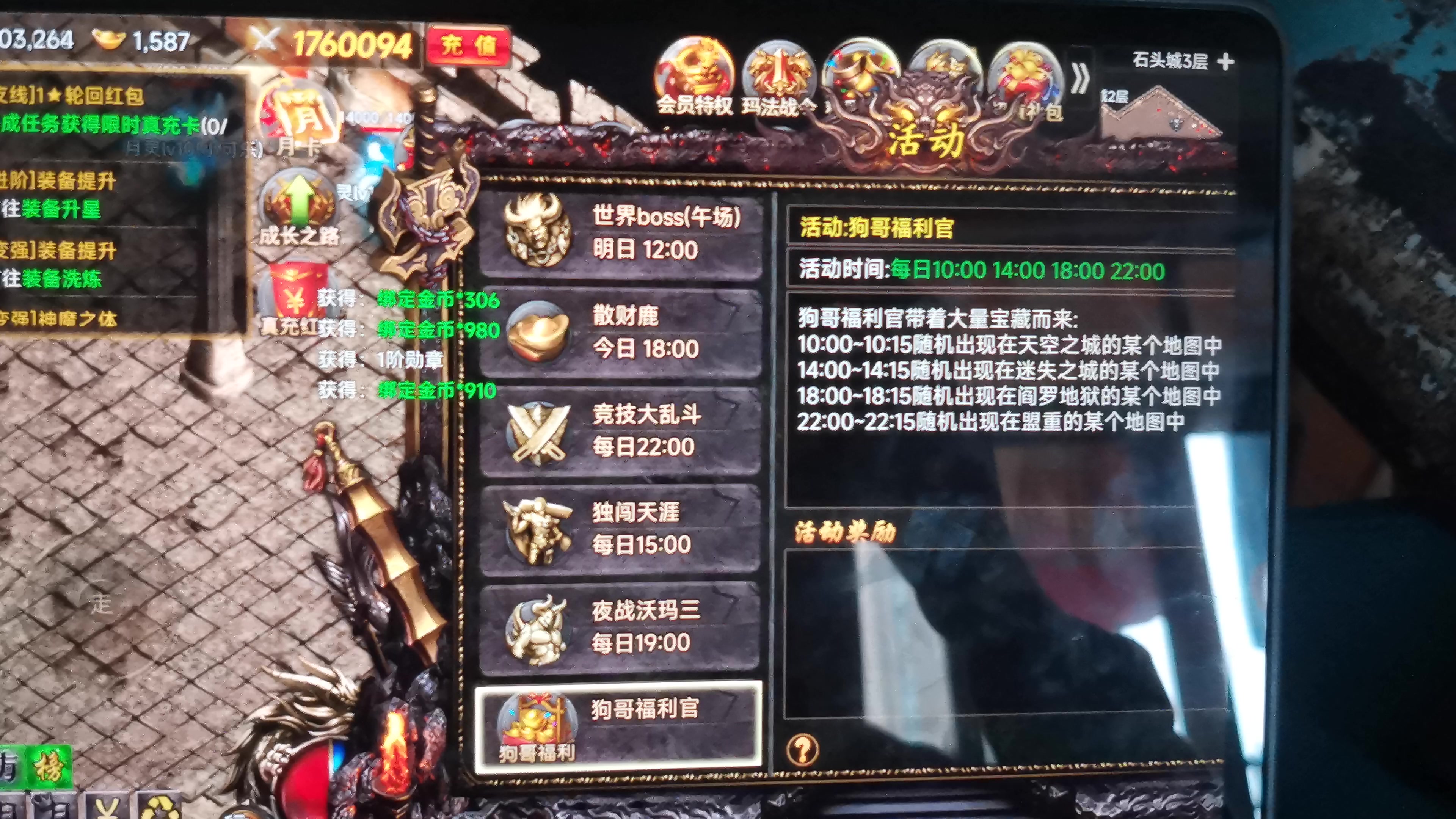 活动里面那个狗哥福利官,每天早上10.-10.15的活动他会刷在天空之城的随机一个地图,跟着提示去找他,找到他。点开,会有250个神魔石头,需要1250元宝,元宝,每天挂机,打boss轻轻松松一千多,完全不怕不够用。这个早上神魔石头非常重要,要不然你3大陆下不了地图!!切记切记!!