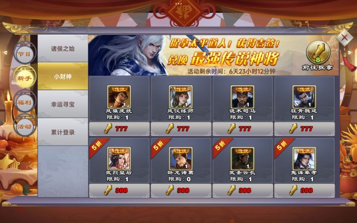 7天拿下诸葛。10周年一个币换50经验书。,差不多能升70个武将。刚好70个硬币左右。一个武将满级50元宝。加上新手赠送的元宝。,全部小财神,然后再加幸运抽奖。,轻轻松松的直接拿下。