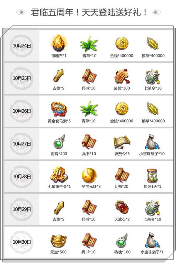 前几天已经预告过即将开启的大陆地区五周年庆活动,相信各位主公已经跃跃欲试。今天小君君就打听到,在下周四开启的大陆地区五周年庆活动中,为主公备好了丰厚的好礼相送!比如,看小君君千辛万苦要来的图↓↓↓没错!大陆五周年庆活动期间,每日登录即可获得丰厚奖励!镇魂石、七星重生令、元宝、吉签、黄金套马索等各种大礼,就等主公前来参加啦!大陆五周年庆活动将会在下周四也就是10月24日正式开启!活动开启当天