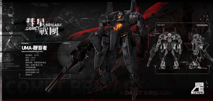 #彗星战团#>>机动装甲<<■代号:鞭笞者 / lasher■型式编号:Ya-27旗帜战争期间,亚罗拉夫·春明机械制造厂在回收了先锋的残骸后,自己研发制造的第二世代“泛用移动装甲”。在旗帜战争后期投入战场,各方面的性能指标都凌驾于先锋之上。鞭笞者作为第二世代机体的标志性特征,便是护盾无人机不再与机体相连,无人机的移动与机载电磁偏转护盾的展开都是由人工智能控制,大大减轻了搭乘者的负担。与