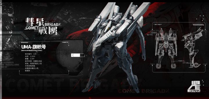 #彗星战团#>>机动装甲<<■代号:旗帜号 / Flag■型式编号:X-0 开疆者联合阵线为开发第二世代机体进行技术铺垫而制造的技术验证机。装甲材料由通常机体的高密度纳米合金改为轻量化合金,重量大幅度减轻,使机动性得到巨大提高,但极为脆弱,对通常机体威胁不大的格林炮都可以轻松将它打穿。为了提升生存能力,搭载了“隐者系统”。这是一种光学迷彩,不仅可以使机体呈现不可视状态,而且雷达,震动探