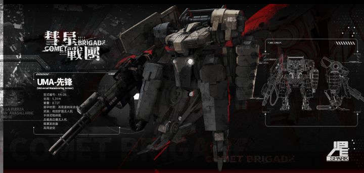 #彗星战团#>>机动装甲<<■代号:先锋 / Pioneer■型式编号:FA-26由开疆者联合阵线开发的,最早投入实战的第一世代“泛用移动装甲”。最大的特征便是它的护盾无人机是线控的,通过近乎透明的线与机体相连,搭乘者通过脑波操纵护盾无人机的移动与机载电磁偏转护盾的展开。这极大地提升了机体的操纵难度。从旗帜战争中期开始,先锋性能逐渐落后。为了弥补性能上的劣势,先锋普遍安装辅助推进器,加