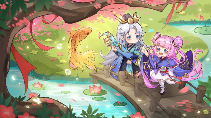 少女正着迷的看着池中的并蒂莲,抬眼却瞧见,木桥上一头戴束发金冠的少年,清
