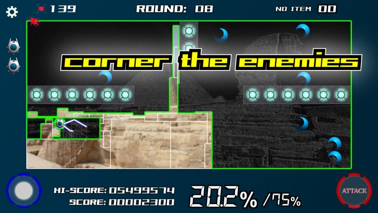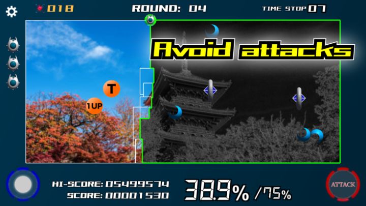 The player moves his/her ship and draws lines on the field to gain areas while avoiding enemies and bullets on the square field. The round is completed when the area acquisition rate reaches 75% or more.
