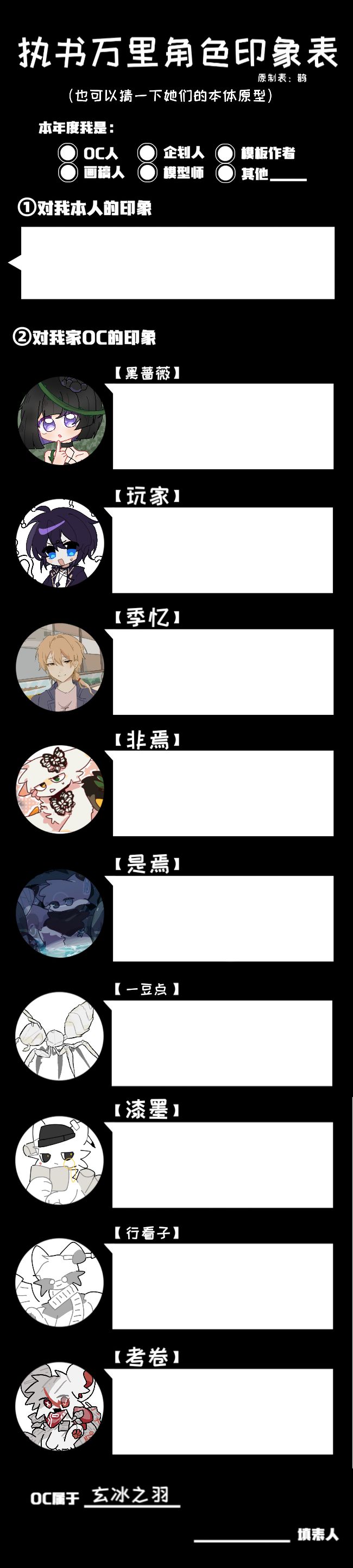 大家好,《执书万里》也首发快两个月啦,相信大部分的角色各位也都看见过了。因此!我们带来了这期新的有奖活动✨✨玩法可以填写玩过游戏后对角色的想法印象,没玩过也可以填写第一想法的猜测也可以进行猜测角色们的本体原型捏最终会在评论区抽取两位幸运儿捏(每张图都可以发一楼,算是给忙碌的人增加成功率啦)活动时间2025年12月15日-2025年12月31日晚上九点奖品随机角色抱枕*2最后的最