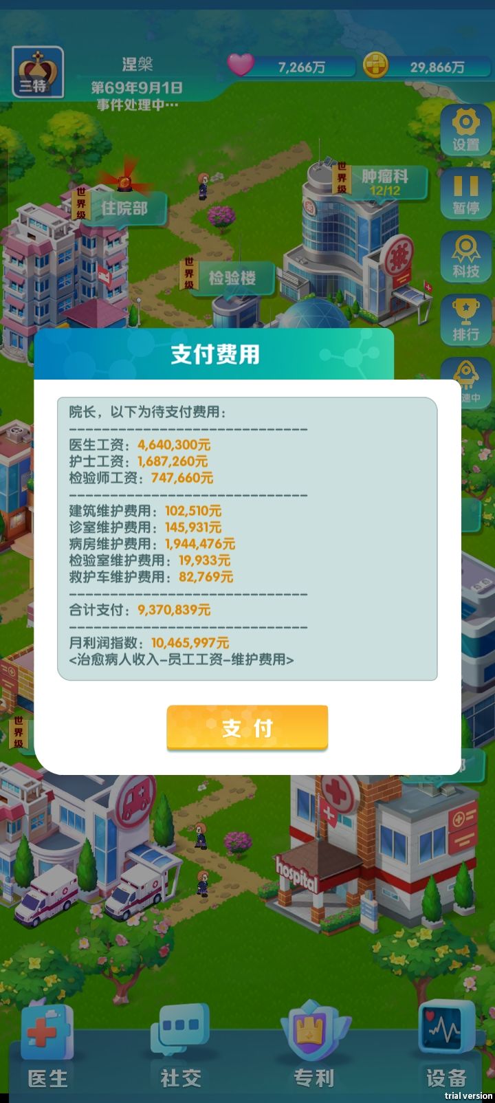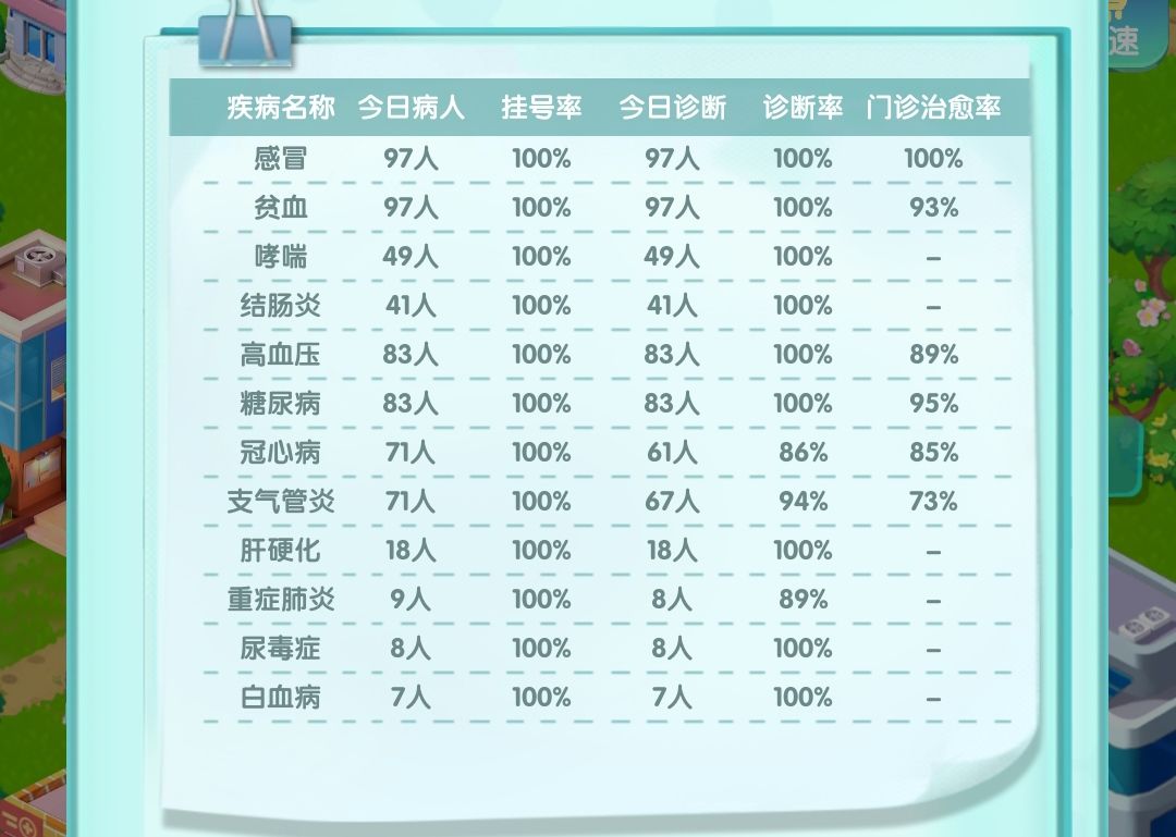 近期很多同学要求我写一篇攻略,我本意是让玩家自己去慢慢摸索然后熟悉的,不过太多同学说难度太高了,没有攻略玩儿不下去,那我就勉为其难写一个吧(做为一个纯理科生的程序员,我真的不想写文字啊啊啊啊啊!!!) 一、【一级丙等】升【一级乙等】阶段 1、这个阶段主要是解锁建筑和前9个疾病,按部就班的解锁就行了(建筑和疾病可以解锁的时候建筑上会有小红点提示,注意观察),唯一要注意的是招了医生过后别忘了去门诊部里