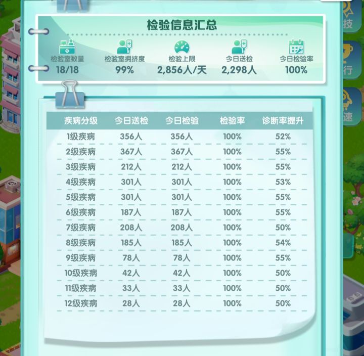 近期很多同学要求我写一篇攻略,我本意是让玩家自己去慢慢摸索然后熟悉的,不过太多同学说难度太高了,没有攻略玩儿不下去,那我就勉为其难写一个吧(做为一个纯理科生的程序员,我真的不想写文字啊啊啊啊啊!!!)一、【一级丙等】升【一级乙等】阶段1、这个阶段主要是解锁建筑和前9个疾病,按部就班的解锁就行了(建筑和疾病可以解锁的时候建筑上会有小红点提示,注意观察),唯一要注意的是招了医生过后别忘了去门诊部里