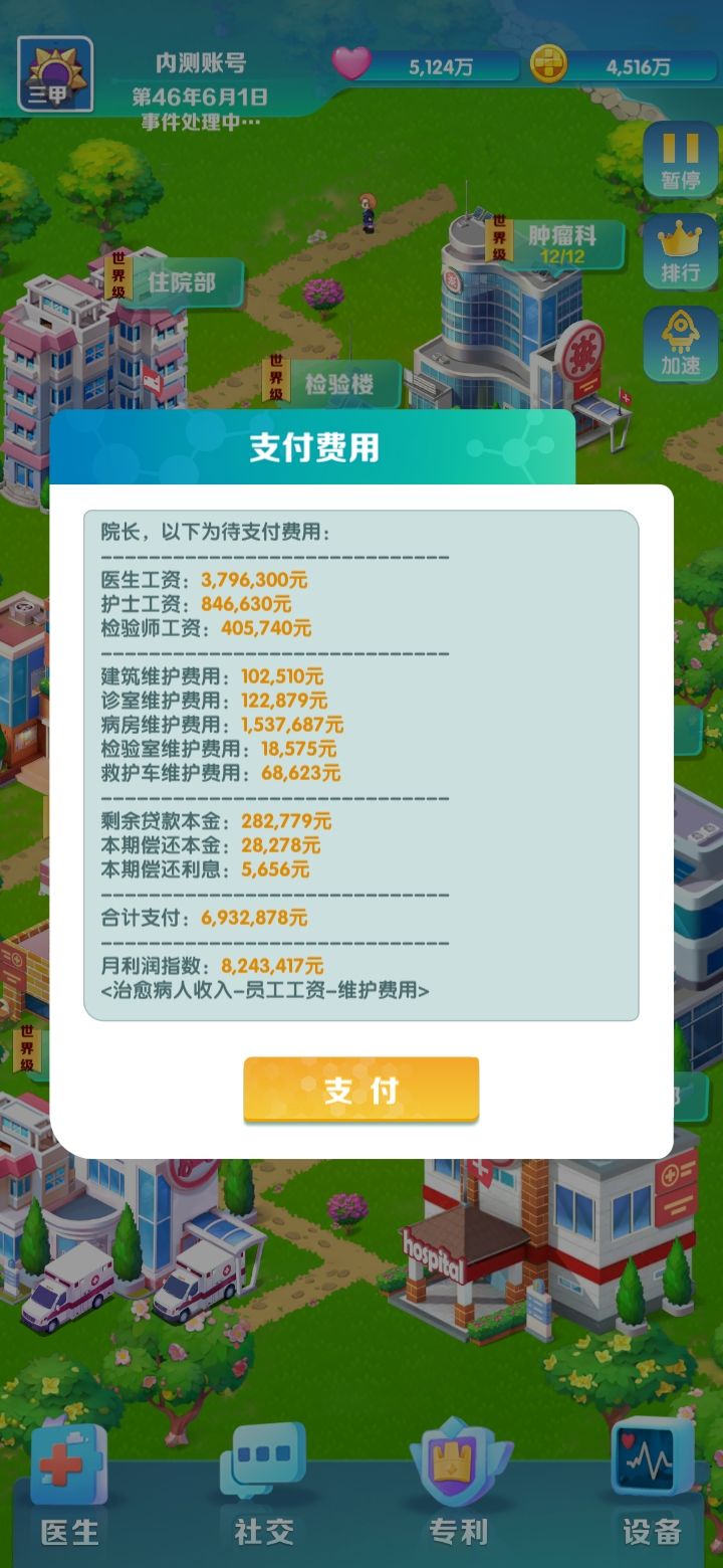 作为支持了程序员的用户,这游戏初期很上脑,后面就逐渐狂躁。一键功能过于少了,作为一个多轮回的游戏,一代目体验,二代目三代目开始是集中精力搞点数,结果你这二代目三代目一直慢慢点,太费神。只能搞一键急诊下班,不能一键急诊上班(最高,最低,指定职位。)不能一键调整门诊精力,住院精力,导致一直都在精打细算,不能一键培训(选择年龄,职务。)建议增加食堂,超市,这俩也是赚钱的项目,尤其是医院的超市。(
