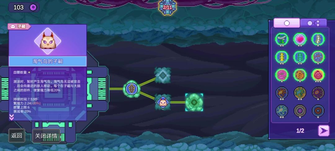 头脑一:给子嗣标记翅膀buff,触发(任意)触角,通过激活触角连接全屏带有debuff的敌人进行打击并且附加debuff 头脑二:给冒头的敌人附加debuff(用于开局) 头脑三:通过debuff高速激活磁力坚果 头脑四:任意回血/套盾 有空位就随便带点子嗣凑数,带多了会卡