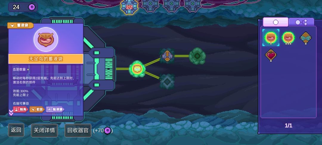 第一个脑用来输出 利用咕咕在无尽里通过升级移速获得效能,配合高效能的独角鲸的肺达成100%斩杀效果。 第二个脑用来触发斩杀效果(怪物没有受伤不会被斩杀)用了触发最快的狂犬脊柱和范围最大的孢子鼠前肢。 第三个脑触发翅膀的增益效果 因为独角鲸的肺触发频率较低,通过触发花仙子的翅确保斩杀效果全程覆盖。 第四个脑用来生成磁铁和心 上了两个磁铁争取全程拾取。 这一套好处是触发效果很少,特效也少,手机应该可以