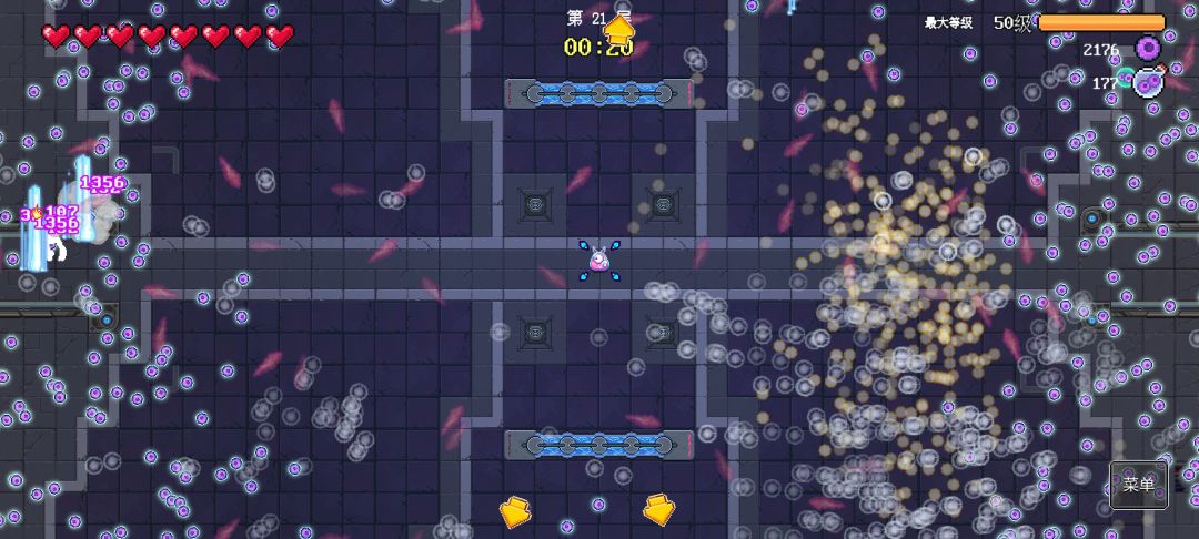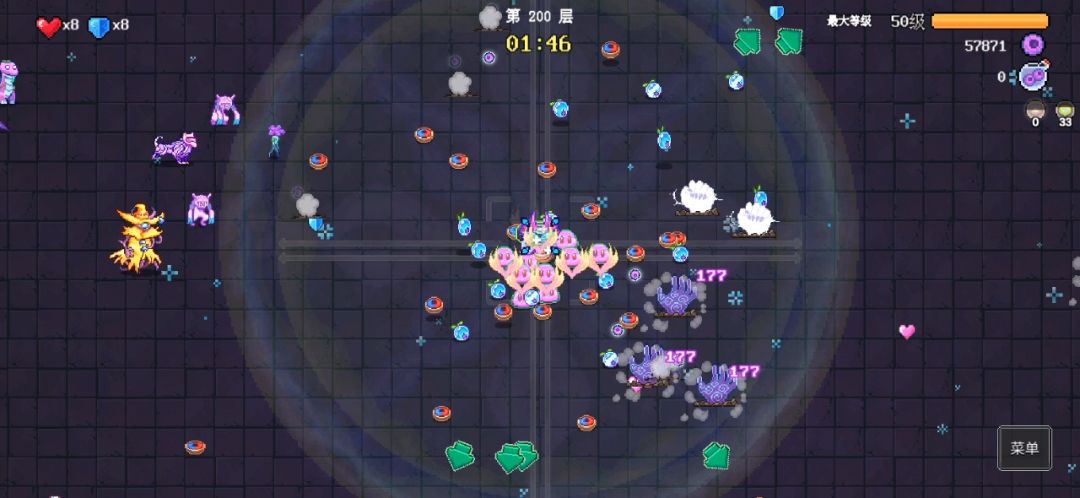 #游戏攻略 最近一直用这个套路,优势是看起来很有气势,也几乎百搭 缺点是弹幕太多了后面手机很卡。 如果是每日挑战用一个脑也是过关无忧。 无尽主要是打困了没试过最终能多少。 基础思路就是触角连环触发产生大量弹丸再配耳蜗进行输出 前面用高频率的部件,比如狂犬脊椎,拳击手神经,反正不靠他输出。 堆个一两轮,配合耳蜗进行输出的触发(最好用“发光触角”,这个没有穿透,不会导致身边打不到),如果是暴击耳蜗可以