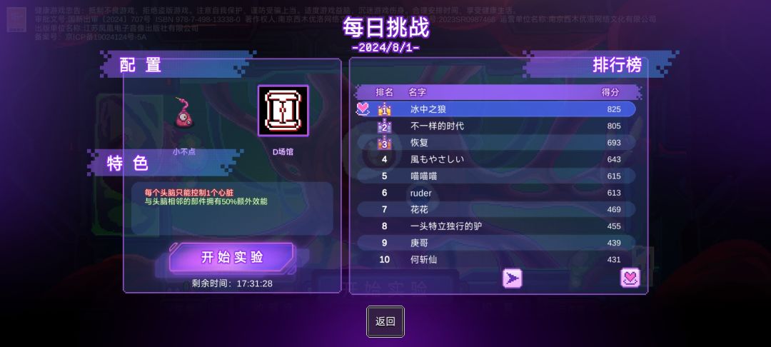 很荣幸今天登了每日挑战的第一名,感觉自己还是可以说下每日挑战怎么才能得高分这件事的。(不过这是自己测试出来的,不是官方数据) 每日挑战影响分数的因素有: 1.每日挑战完成总时长。 包括整理变异和升级培养的时间。 2.大脑部件连接数量,连接数量越少,分数越高。 暂时发现的只与这两个因素有关,至于是否和最终角色等级有关还不清楚。 对于容易误解的点: 1.分数和扣血量有关系,应该避免受伤。(错误观点) 我