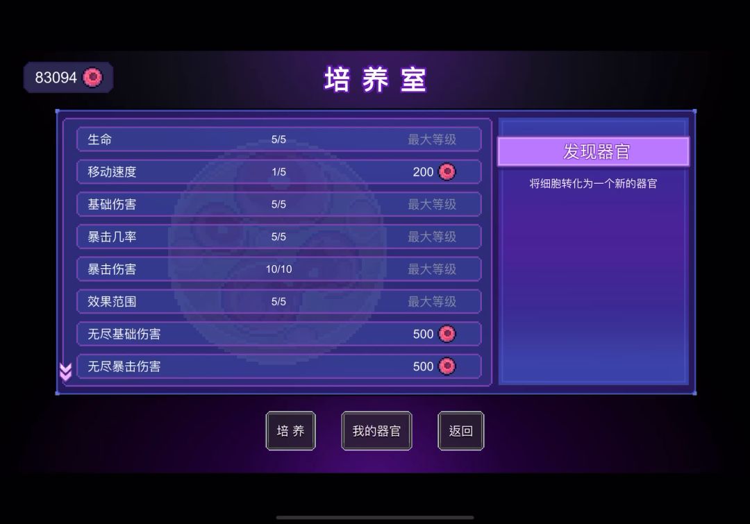 在刷全成就过程中想到的,咕咕可以通过培养提高效能,薛定谔的腹最大初始斩杀线是14%,只要效能≥715%就能把斩杀线提高到100%以上,(可以接薛定谔的腹的最高效能器官)独角鲸的呼吸系统最高效能是500%,即最少需要2.15+50%=265%的效能提升即可达成100%血线斩杀效果(刷出来的独角鲸的腹效能越低,需要培养的效能提升越高) ps:这游戏创意是挺不错的,不过难度有点太低了,虽然几乎是纯肉鸽,