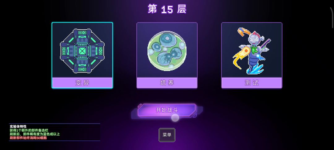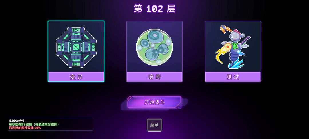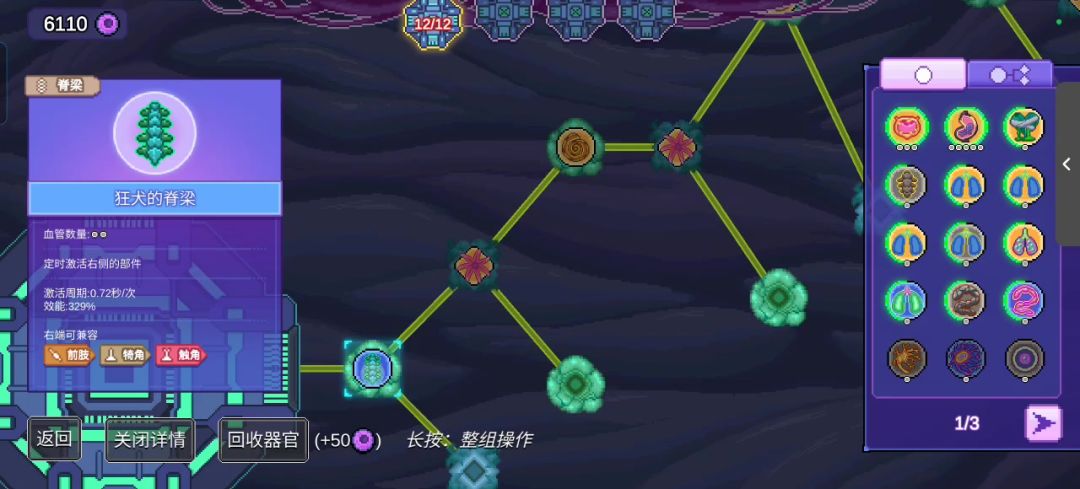 这是萌新最容易上手的玩法,玩法的一般思路是一个先用频率快的脊椎(因为频率快更容易有更多弹幕,一开始要堆量,用量触发后面伤害高的部件),第二件拿触手,触手在这个游戏的本质就是堆积弹幕,让后面的部件随着弹幕把效果打出去。第一件和第二件组成了一个发射弹幕的组,接着来构建第二组;第二组的第一件,不用是脊椎了,因为此时左侧不是大脑了,可以连耳蜗,然后再搭配一个触手,第二组就形成了;顺着第二组的思路可以构建第