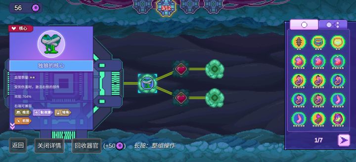游戏目标:走位避开怪物,并存活过第十五层或击败十五层boss玩法:击杀怪物,获得细胞升级提升自己1.每次升级时可以获得一个器官部件。 进入下一关可以获得一个部件。2.下一关开始,获得的部件随机每次三选一;部件分两个类型○和◇,○激活器官,◇功能/攻击器官3.选完奖励后,进入备战环节包括三个部分;①.变异:即安装器官部件;起始顺序必须以:○→◇→○→◇以此类推○→◇为一组,激