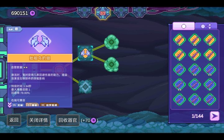 游戏目标:走位避开怪物,并存活过第十五层或击败十五层boss玩法:击杀怪物,获得细胞升级提升自己1.每次升级时可以获得一个器官部件。 进入下一关可以获得一个部件。2.下一关开始,获得的部件随机每次三选一;部件分两个类型○和◇,○激活器官,◇功能/攻击器官3.选完奖励后,进入备战环节包括三个部分;①.变异:即安装器官部件;起始顺序必须以:○→◇→○→◇以此类推○→◇为一组,激