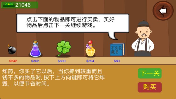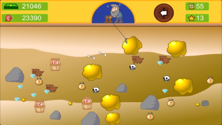 黄金矿工中文版,赶快来体验一下吧!游戏道具:点击屏幕开始拉金子,黑色的炸弹意思是拉到你不要的东西用它就可以把你自己拉的那个东西炸掉,紫色的瓶子是强力水,在回收绳子的时候速度稍快点,只在一局中生效;石头收藏书,是说收集了石头的话,可以比平时卖的价钱要高!11块的小石头可以卖33块,同样是一局中生效;黄色的瓶子里的东西是钻石油,会使钻石升值,600的钻石会卖到900!也是一局中生效;拉到“?”的袋子的话,可能变的很强壮,也可能得到以上某些物品,并且有时会连卖的石头价格都上升!