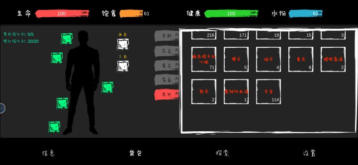 我才活过37天,后面有新的心得了再补。1.先去探索城镇——居民区,搜出一把厨房刀,去背包里装备到手上。2.有了武器之后,去医院探索几次,大概率手上会有几个创口贴(小血包),1-2个医疗绷带(大血包),一些维生素(+健康值的),运气好搜到1-2瓶洗手液(+血+健康)更好。3.不要贪心,有保证不会暴毙的药品后,立即去湿地公园搜索,湿地公园比家还像家😏。湿地公园有前期必备食物【树莓】(提供食物+