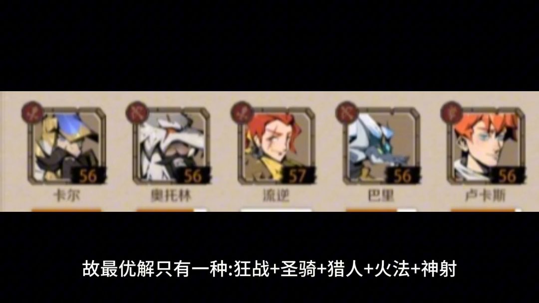 昵称:浮萍 主角选狂战士,辅以圣骑士(卡尔)、狂战士(奥斯汀)、火法师(卢卡斯)和猎人(奥托林),若没有奥斯汀可以用神射手(巴里)替换。 建议卡尔早点入队吃经验,保证坦克的等级和装备能跟上第一梯度,有利于缓解卡关的问题;奥托林可以最后入队,培养优先级也最低。(三大陆后阅历值不缺,猎人天赋可以加两套方案,一套纯点和宠物加成有关的天赋,让宠物打伤害) 我的理解是40级前缺坦度,40级后缺伤害,这两个缺